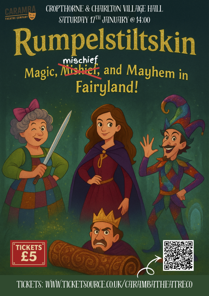 Pantomime – Rumpelstiltskin will be performed at the Village Hall on Saturday 17th January at 2PM. The performance will be presented by Caramba Theatre Company and tickets are available now, just £5 each, children and adults the same! There are plenty of seats left so come along for a fun-filled afternoon of merriment for all the family – or come on your own!